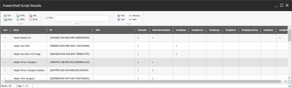 | $Results | Select-Object Page, RenderingItemName,RenderingItemID,RenderingItemPath,Global_Cacheable, Global_ClearOnIndexUpdate, Global_VaryBy* | Show-ListView |