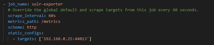 Now that metrics are being exposed by Solr we can add a new job to the Prometheus configuration to scrape these metrics. We can verify Prometheus is able to scrape the solr exporter target using the Status view and confirm our new job is running and Prometheus is scraping metrics.
