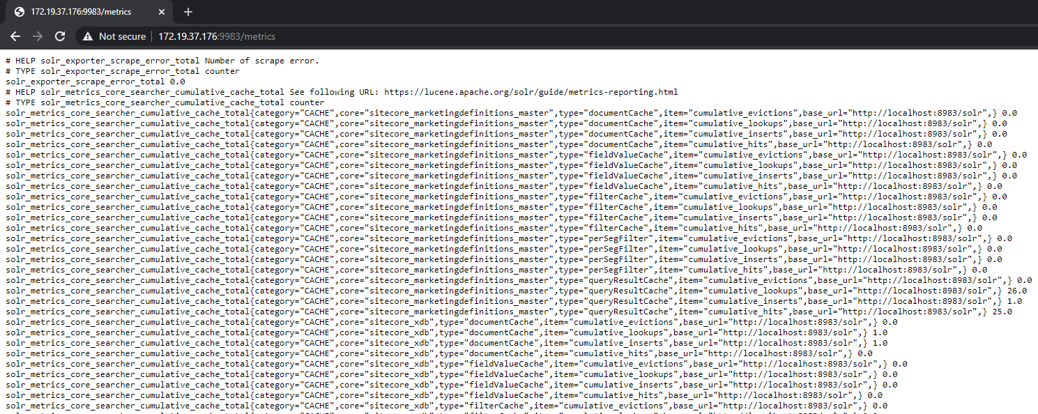 As I mentioned the exporter is included in Solr 7.3 this is great if you are running Sitecore 9.2 or above as you will have the exporter already in your Solr container. But what if you are running an earlier version of Sitecore and want to scrape Solr the exporter is available on GitHub and can be copied to your container as long as you are running a compatible version of Solr with the metrics api.