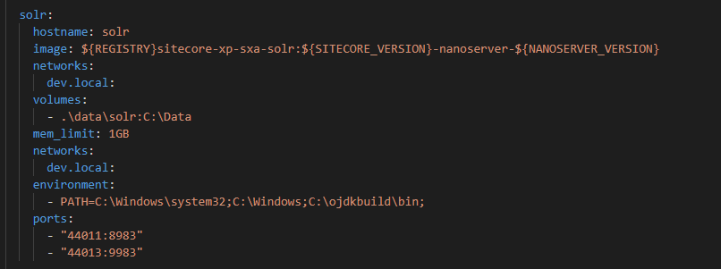 If we modify the Docker Compose and add a port mapping for the Solr Exporter port and also include the PATH environment variable.