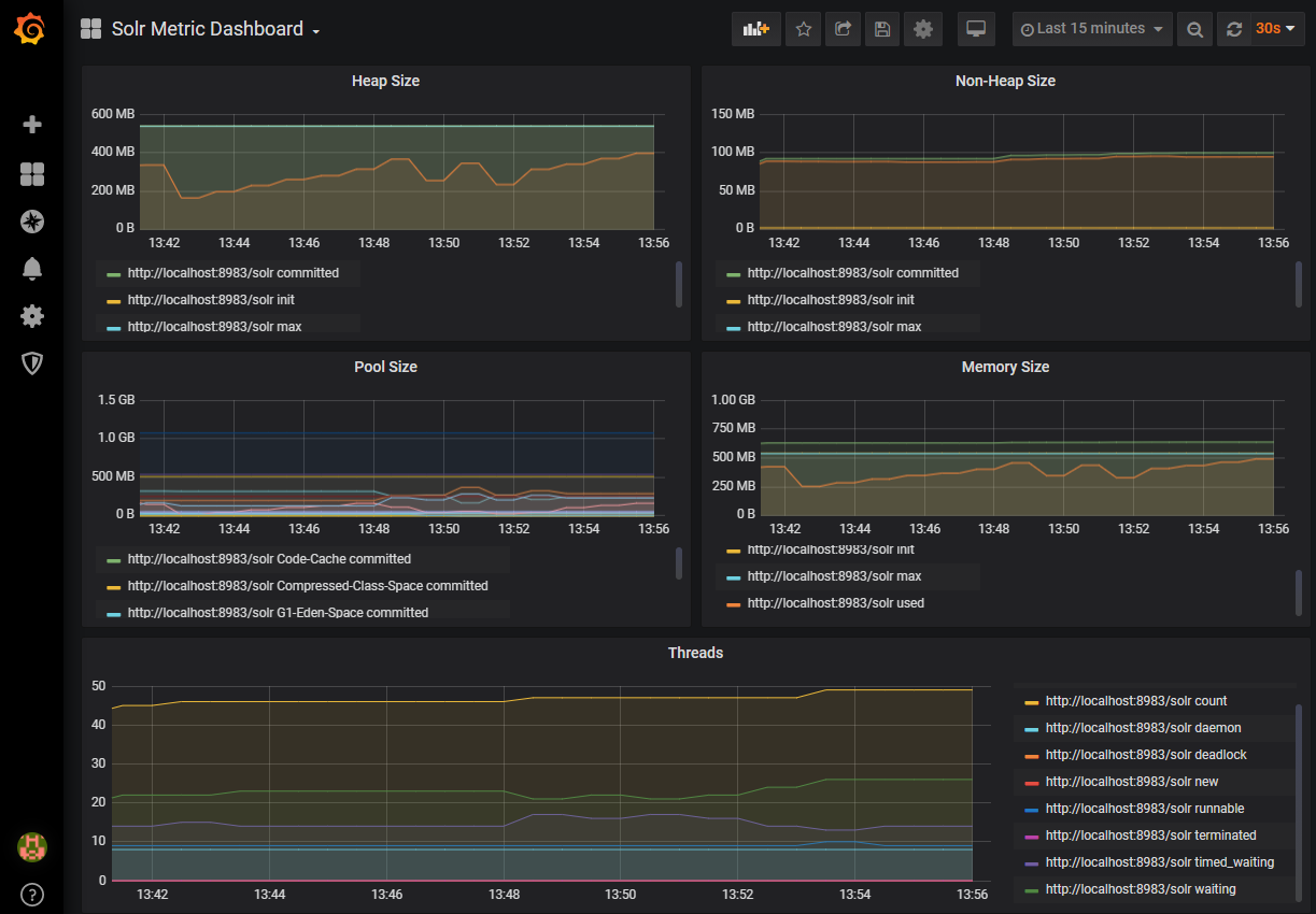 Now that our metrics are being scrape we can create a dashboard in Grafana to monitor those metrics. Solr provides a decent example dashboard for us, simply add the following JSON file: contrib/prometheus-exporter/conf/grafana-solr-dashboard.json to your Grafana instance and ensure it is pointing at your Prometheus datasource.