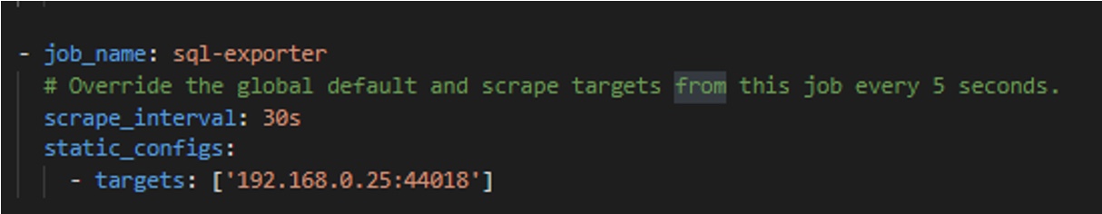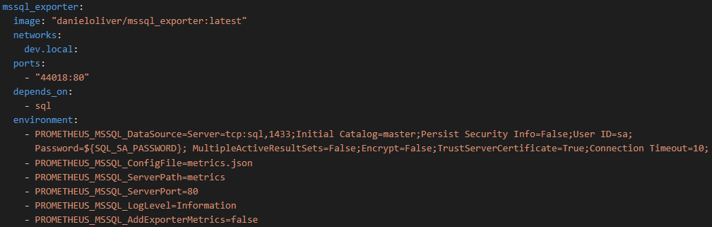 While considering creating a custom .net exporter I stumbled upon MSSQL Exporter for Prometheus. Written in .net this exporter also allows you to specify metrics in a configurable metrics.json file or within the docker compose file. The connection string is set via an environment variable making it easy to configure.