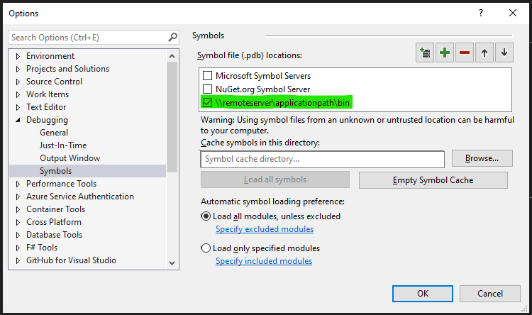 Alternatively you can copy the pdb’s from the server to local directory and either specify this location in the symbol file locations or add the directory to the Cache symbols in this directory field.