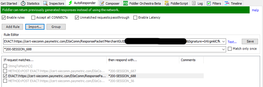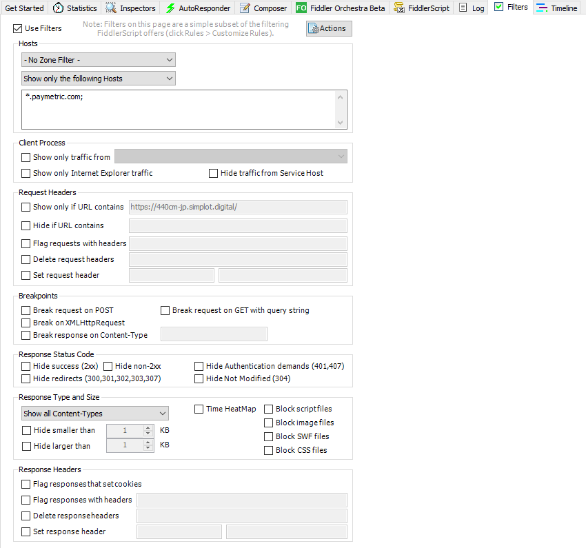 First thing you will want to do is to apply filter for the service/requests you are interested in, as fiddler monitors all web requests/responses. Doing this will help remove some of that noise and allow you to focus on the traffic you are really interested in. In the example below I have filtered out traffic for online payment provider paymetric.com.