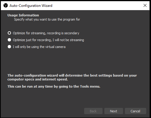 The Wizard should start automatically the very first time you fire up OBS. Or you can access it from the Tools Menu. It will ask you want your specific use case for OBS Are you planning on Streaming or Recording or just using the virtual camera and then optimize based on your selection.