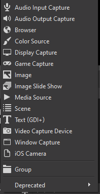 3. We will need to add a Video Capture device to the scene. With the scene selected click on the plus button on the sources panel. This will display a list of possible sources.