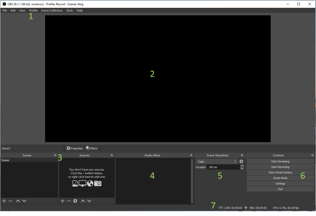 1. The Menu Bar includes “File, Edit, View, Profile, Scene Collection, Tools and Help” menus. The Profile and Scene Collection are really useful.