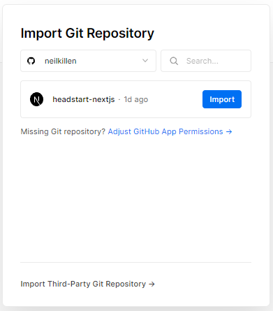 4. Once the Vercel is set up to access my repository, click Import to import the headstart-nextjs application. Vercel auto-detects the app is using Next.js and sets up the build configuration.