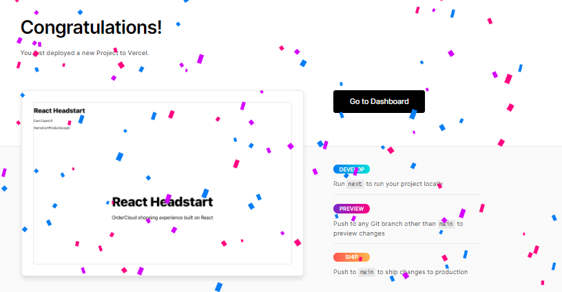 7. Once completed, someone at Vercel fires a Confetti Cannon, letting you know the process is complete and your Next.js application has been successfully deployed YEY!! And providing you with a public URL and a fancy dashboard with information about your application.