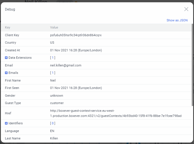 - bid_{clientKey} – cookie persists the browser ID between sessions. It generates a Universally Unique Identifier (UUID) that is unique per browser until the cookie expires or is deleted, then a new UUID is generated. Boxever data capture cookies expire after two years of inactivity. You can use this for locating the guest by entering bid: value in the search box.