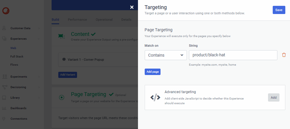 7. Now we’ve only created our Popup Experience we have not made it live yet. But before we make it live I want to include some Page Targeting, as I do not want this popup appearing on every page and only want to target specific pages like my Hat Product Detail page. To do this click Add on the Page Targeting section of the Experience. Here you can specify rules that define which pages you want your experience to target. I’ve created a really simple rule: if the URL contains my product page i.e. “product/black-hat”, and clicked Save. With this rule in place, my popup will only show when the URL contains product/black-hat.