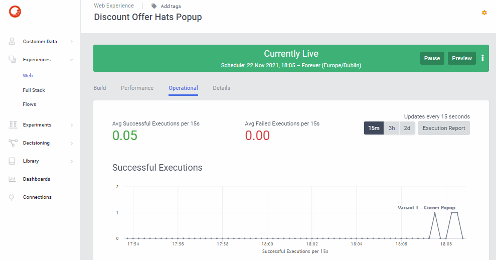 8. To start the Experience click Start, you have the option to either start it immediately or schedule it to run for a specific period. Once the Experience has been started you can easily pause it, check the Performance metrics, Operational metrics, and Details about the experience.