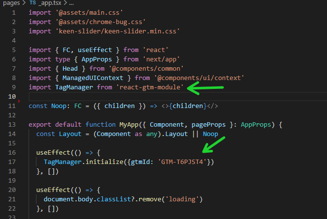 Once installed I just need to modify the _app.tsx to initialize GTM by including the following:
