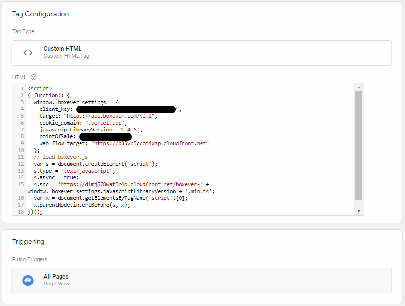 4. Replace the {{clientKey}}, {{apiTargetEndpoint}}, {{cookieDomain}}, and {{clientVersion}} attributes with your own client key, API target endpoint, cookie domain, and version and click Save.