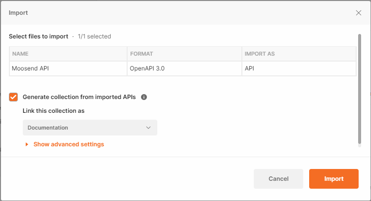 Authentication is achieved through the use of an API key. Before you can use the collection you need an API key for your account. The API key is included in all the requests sent to Moosend. When I look at the imported collection there is a hardcoded apiKey (it’s not mine), this is specified in all the requests. It is included in the download blueprint specification.