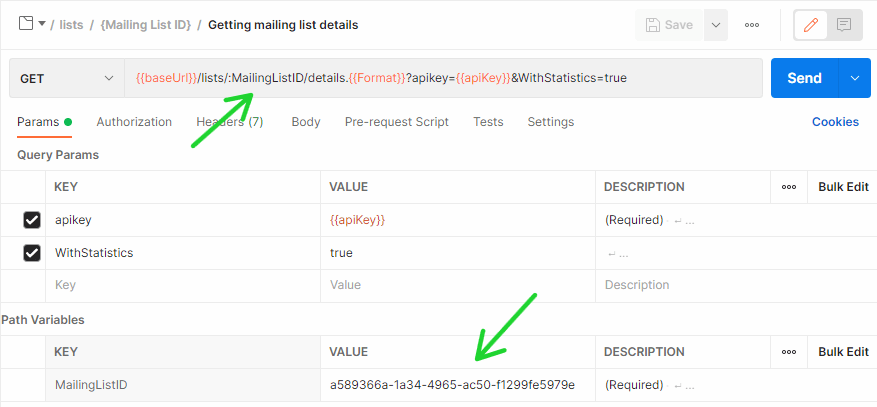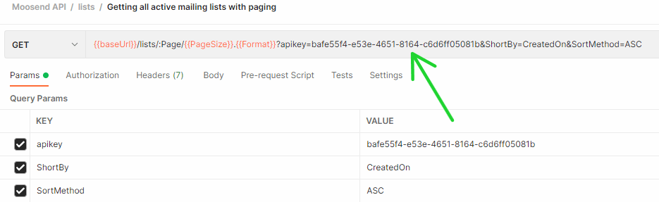 Ideally, this should be a variable as you most likely will be working with different accounts. This can be easily replaced using the inbuilt find and replace feature in postman and replacing it with {{apiKey}}, alternatively, replace before importing the converted open API spec. We can then create a new apiKey variable and populate it with your own apiKey. You can obtain your API key if you head over to Moosend -> Settings -> api key.