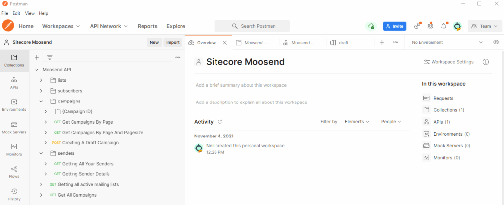 Boom! Postman creates our lovely Sitecore Send (Moosend) collection: