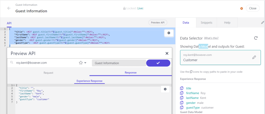 You can easily test the API response in the API editor by clicking the Preview API button and selecting an existing guest account. Once you are happy with the API response you can Save and Close the variant and Start the experience.