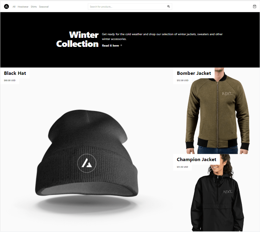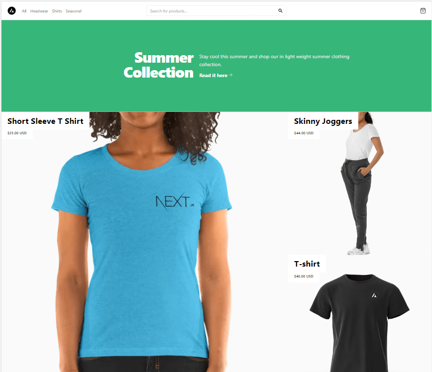 To demonstrate this I’ll use the NextJS Commerce template and add some seasonal product pages. Customers visiting the site located in the Northern hemisphere would see the summer collection while visitors in the Southern Hemisphere would see products from our winter collection when they click on the seasonal navigation link.