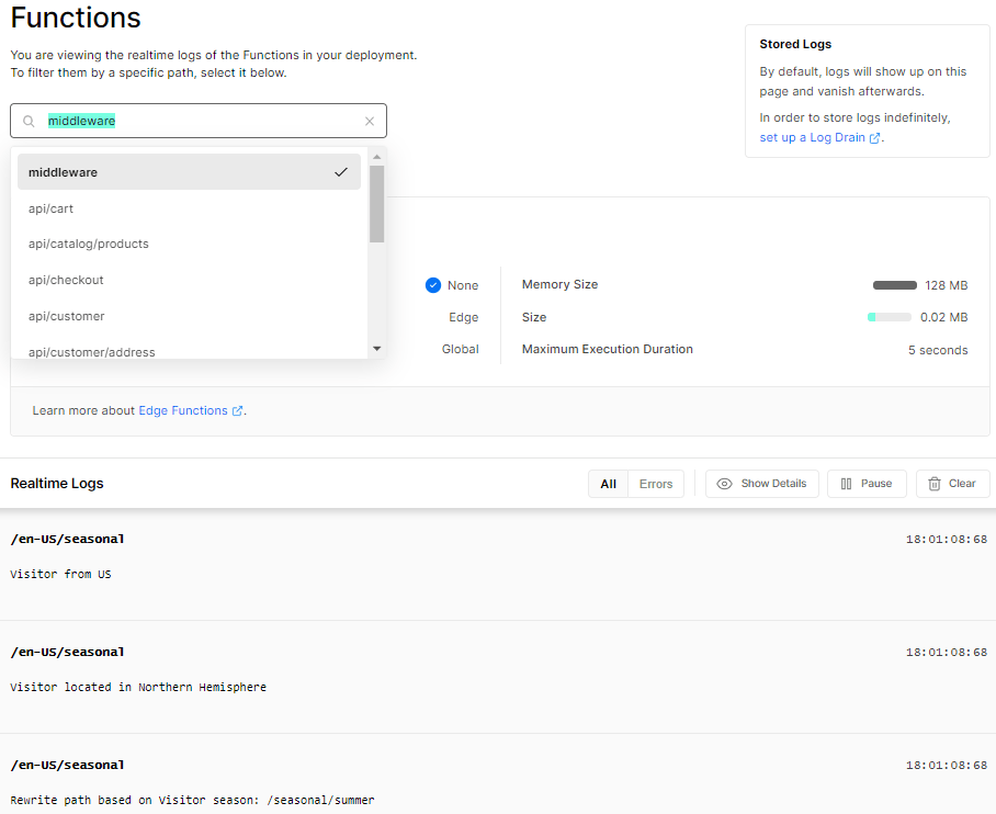 As we already have a Middleware function running against a specific path we will add another path for ‘/store’ to our match config. So our middleware now only runs when the request path matches either ‘/seasonal’ or ‘/store’.
