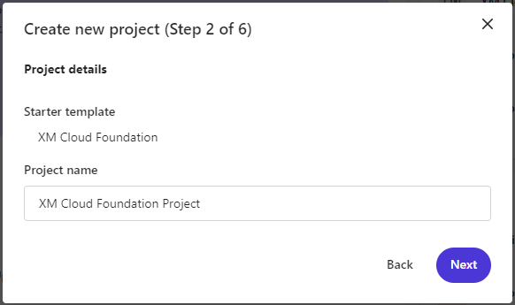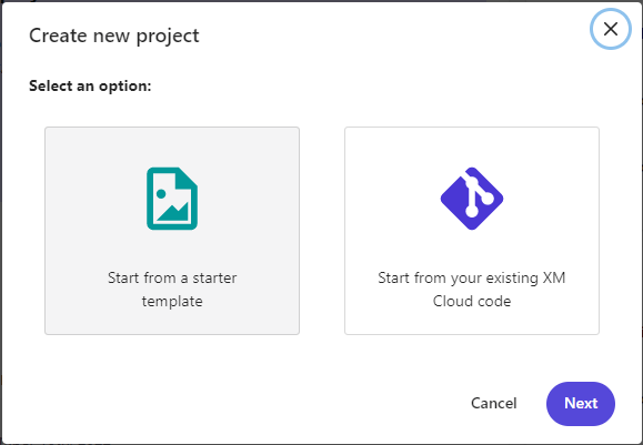 3. Select the option: Start from a starter template and Click Next. This will start the 6 Step process of configuring a new template-based XM Cloud project.