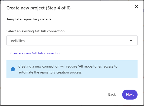7. Step 4 – Template repository details. You can choose from existing GitHub connections or Create a new connection. Select your GitHub connection and Click Next.