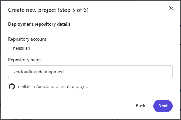 6. Step 3 – Deployment repository details. Here is where you can specify the source code solution provider to use for the location of the solution where it will be cloned. Currently, GitHub is available as an option, Sitecore might provide others in the future. Select GitHub and Click Next