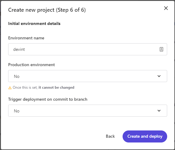 9. Step 6 – Initial environment details. Here you can specify information about the environment for your project including Environment Name, whether it is a production environment or not (note this cannot be changed once set), whether or not to trigger a deployment on each commit to the repo branch. Once you Click Create and Deploy.