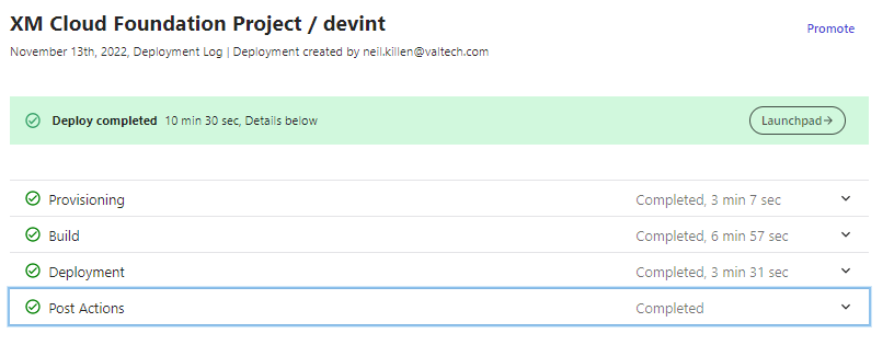 Notice there is also the option to Promote. I’ve not tried this out yet, however, I suspect if you had multiple environments, for your project like a Stage and Prod you should be able to select and promote your build to another env.