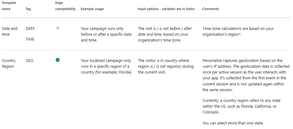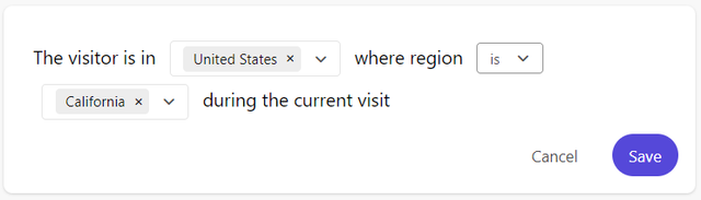 Country Region condition – was added in August and allows you to combine country and region for personalization based on the geographic location of your visitors. Initially, this condition supports the United States as a country and all its states as regions.
