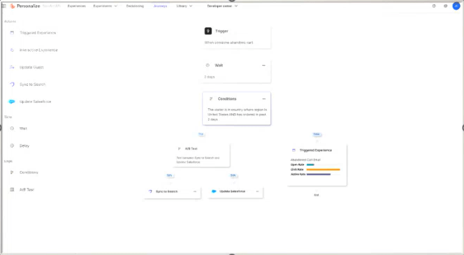 Sitecore is working on a common use case: an abandoned cart flow; as a proof of concept. This involves triggering an event that starts an email sequence. After a set delay, a condition checks whether an order has been placed within the past two days. If true, a second email flow can be triggered, allowing for further engagement.